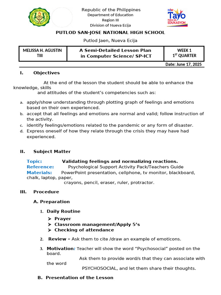 MELISSA H. AGUSTIN A Semi-Detailed Lesson Plan WEEK 1