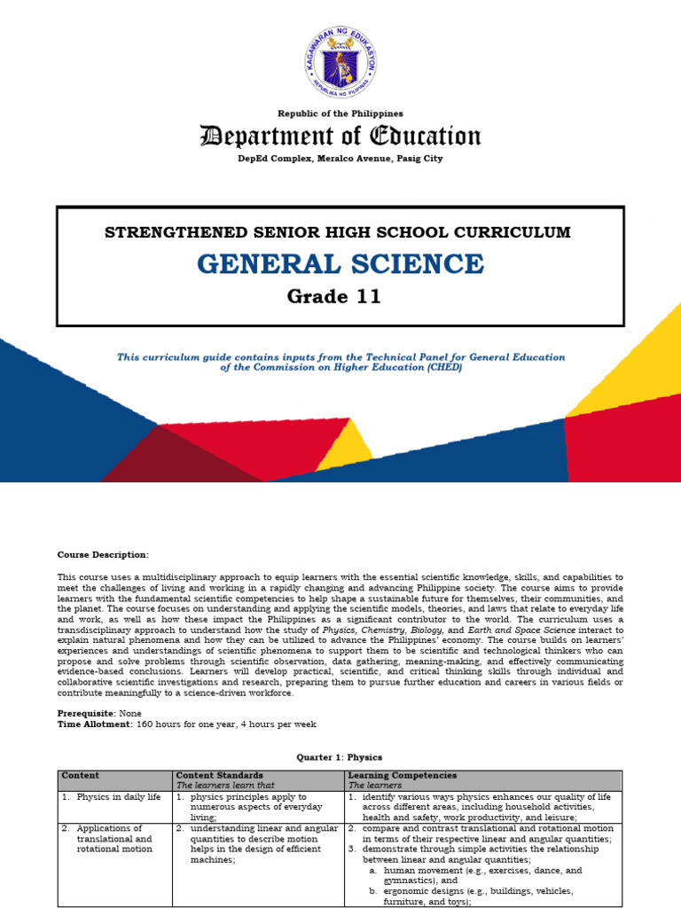 By the end of the quarter, learners identify general physics principles and their applications in daily life. They use scientific