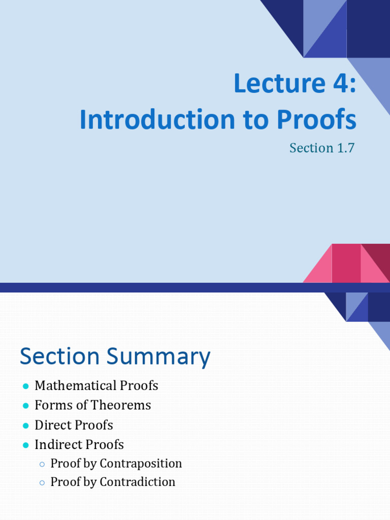 ● Direct Proof : Assume that p is true. Use rules of inference,