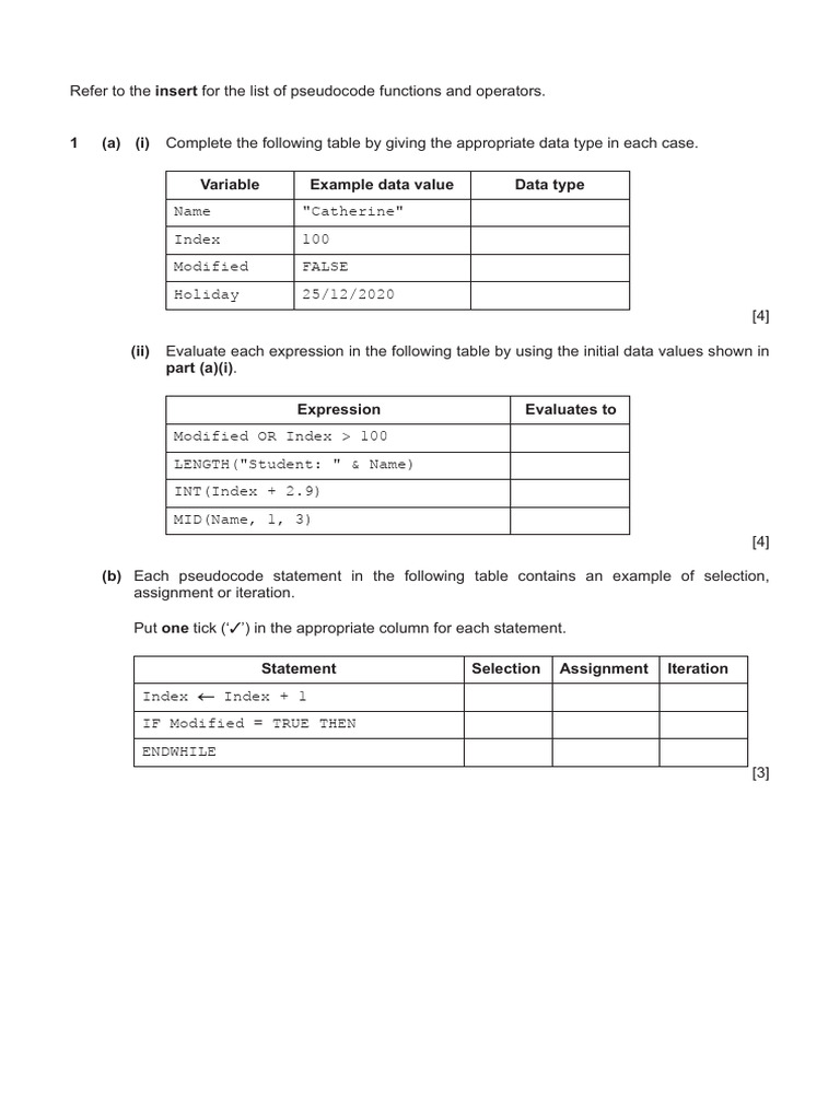 1 (a) (i) Complete the following table by giving the appropriate data type in each case.