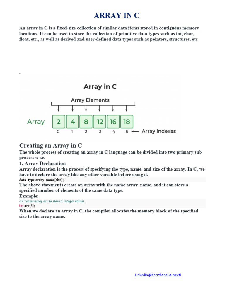 An array in C is a fixed-size collection of similar data items stored in contiguous memory