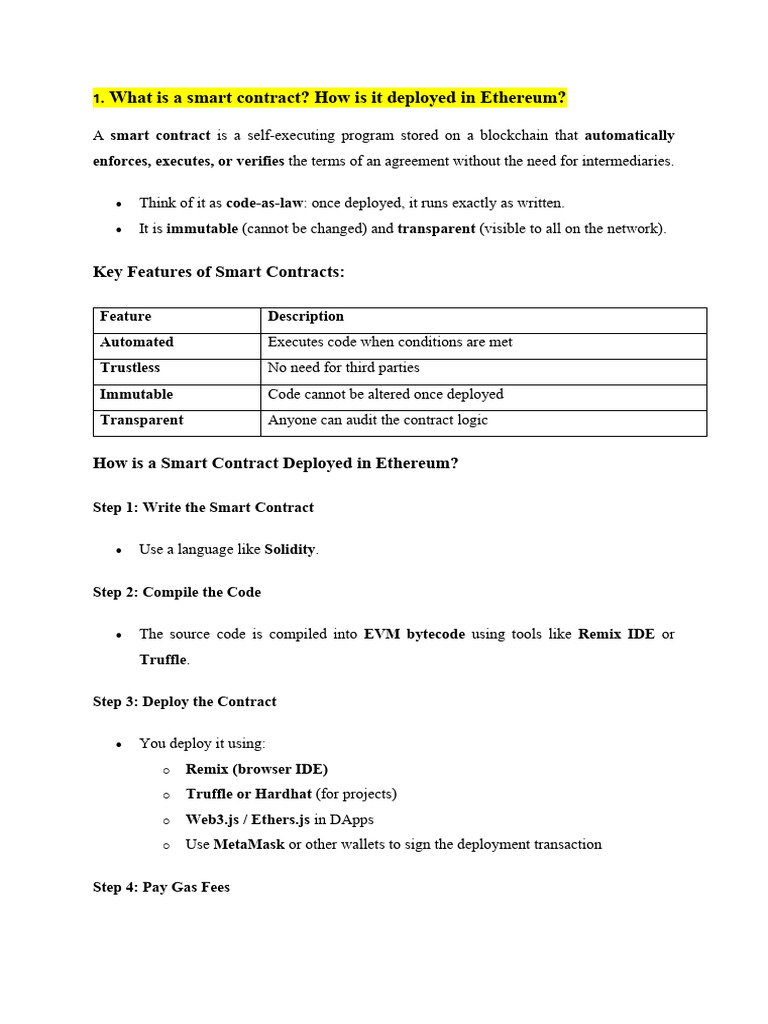1. What is a smart contract? How is it deployed in Ethereum?