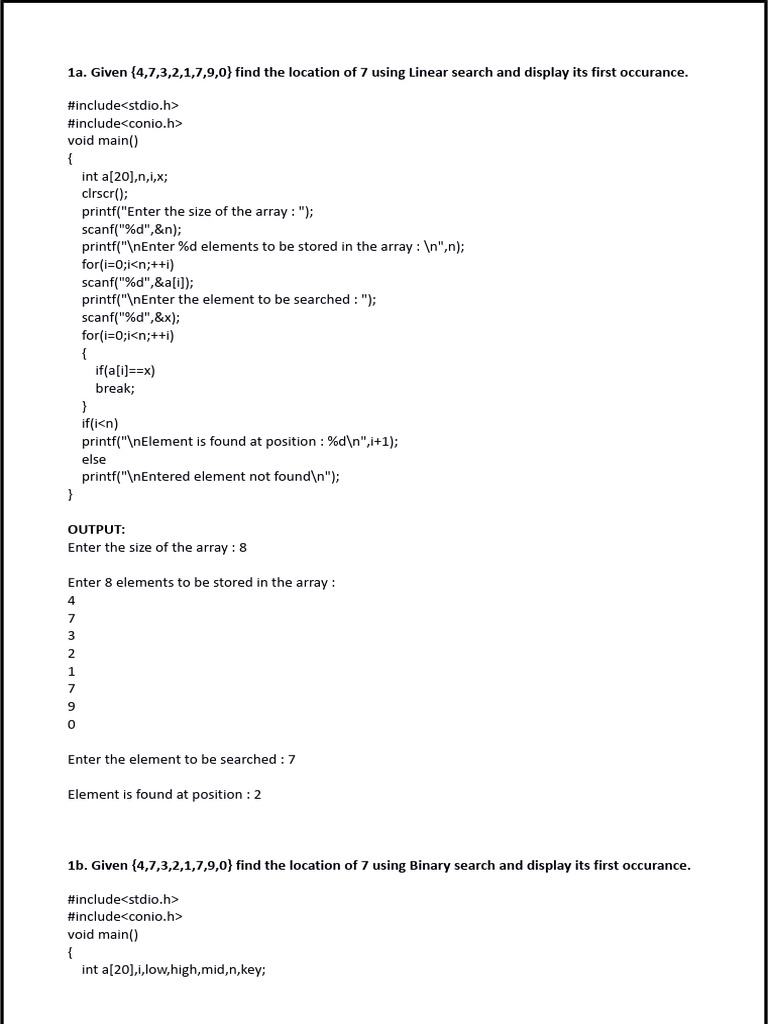 1a. Given {4,7,3,2,1,7,9,0} find the location of 7 using Linear search and display its first occurance.
