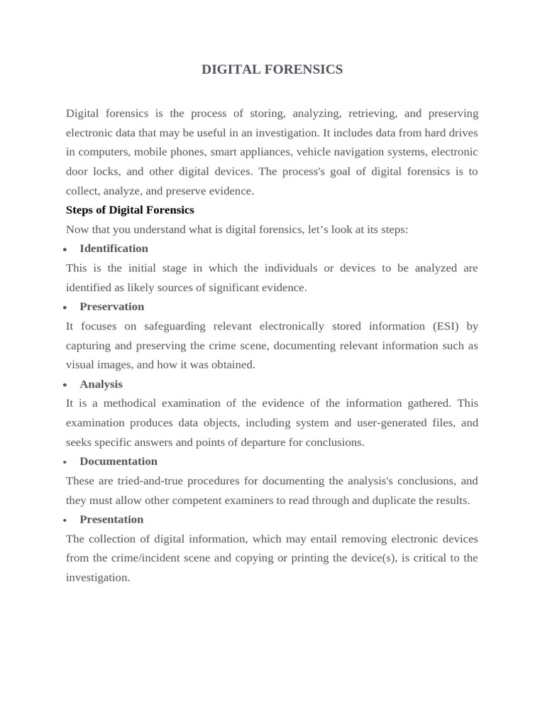 door locks, and other digital devices. The process's goal of digital forensics is to