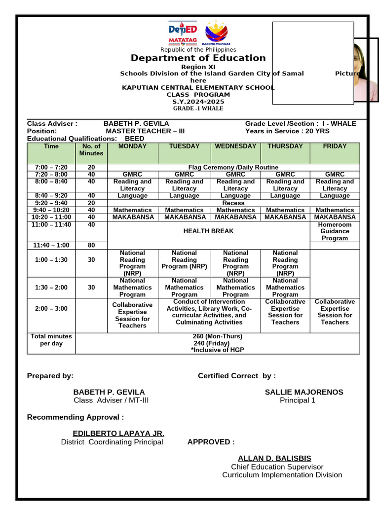 Class Adviser : BABETH P. GEVILA Grade Level /Section : I - WHALE