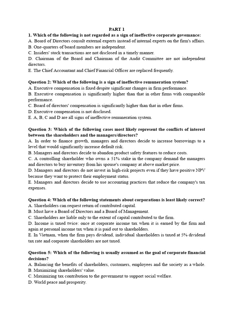 1. Which of the following is not regarded as a sign of ineffective corporate govemance: