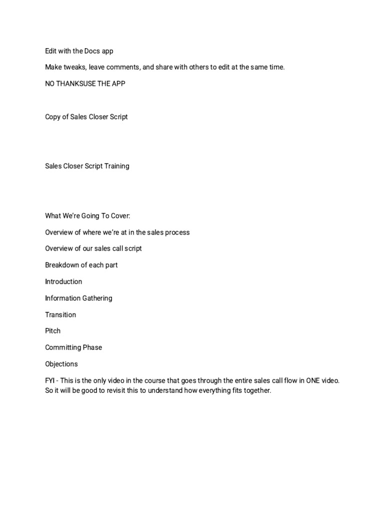 as have you send in your current sales script and pitch as well as a call for me to review for