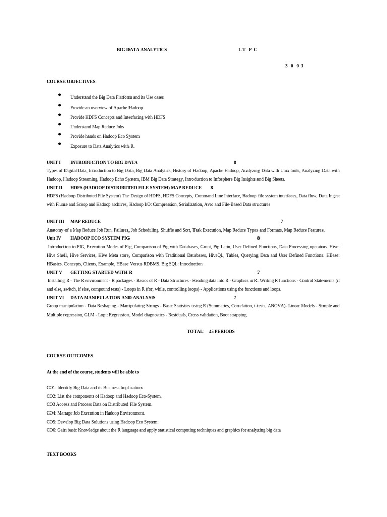 CO6: Gain basic Knowledge about the R language and apply statistical computing techniques and graphics for analyzing big data