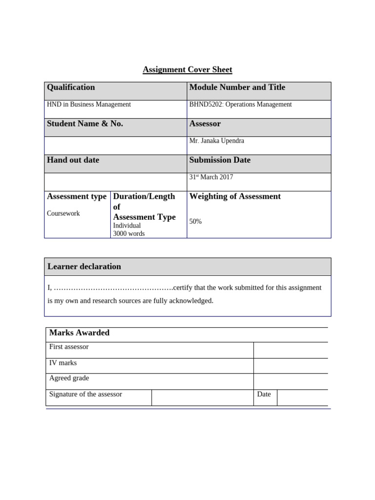 HND in Business Management BHND5202: Operations Management