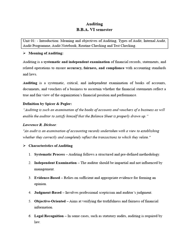 Unit 01: - Introduction: Meaning and objectives of Auditing, Types of Audit, Internal Audit,