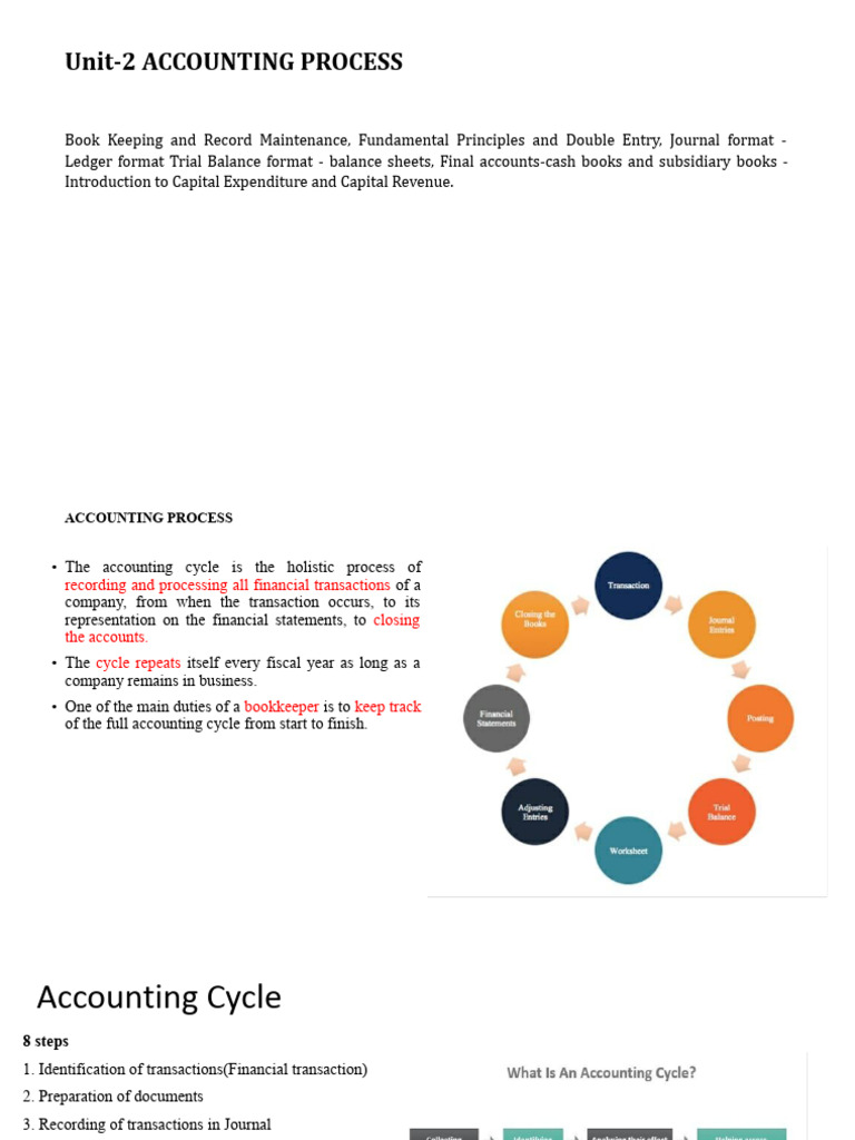 • The first step in the accounting process is identifying and recording of transactions in the books of accounts.