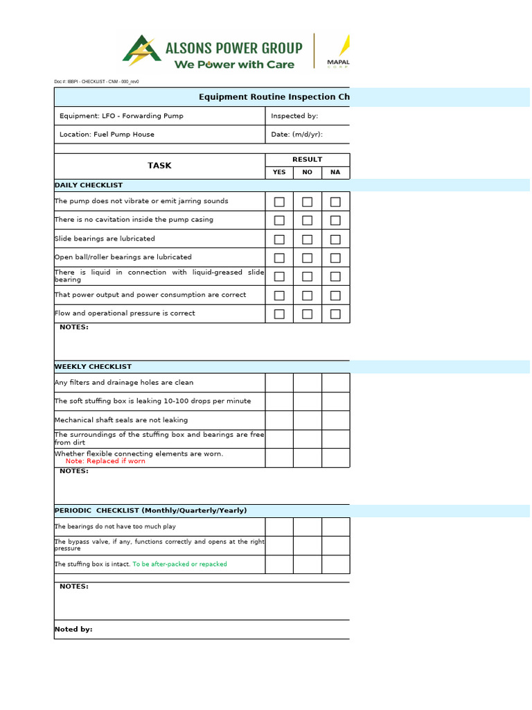 PERIODIC CHECKLIST (Monthly/Quarterly/Yearly) : ENGINE DRIVEN