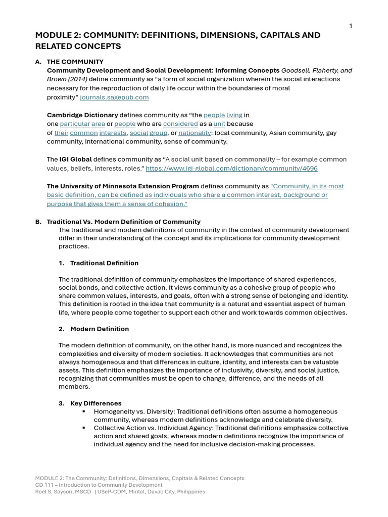 The traditional and modern definitions of community in the context of community development