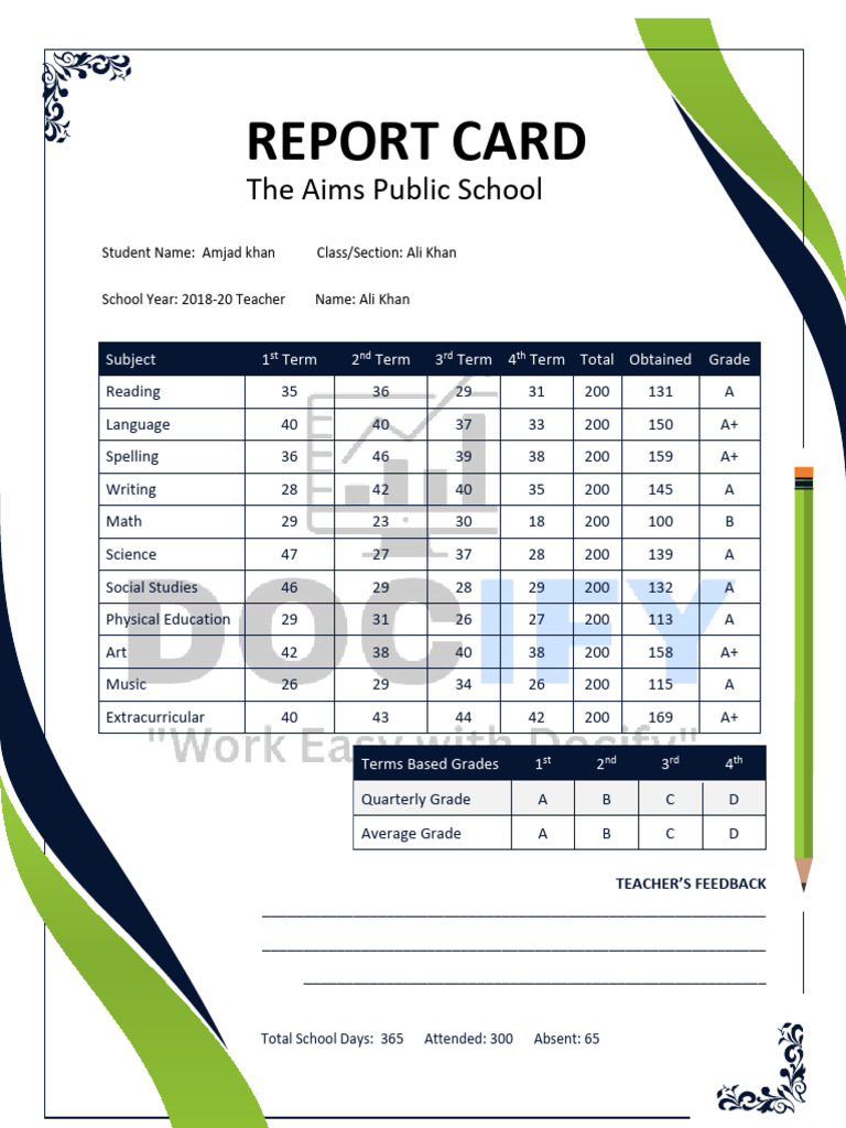 Subject 1st Term 2nd Term 3rd Term 4th Term Total Obtained Grade