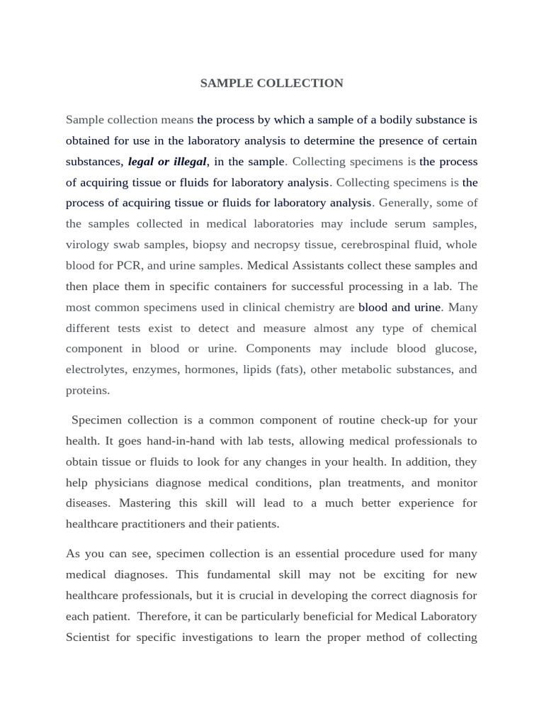 substances, legal or illegal, in the sample. Collecting specimens is the process