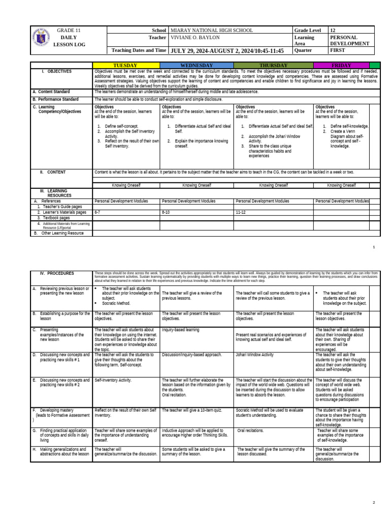 DAILY Teacher VIVIANE O. BAYLON Learning PERSONAL