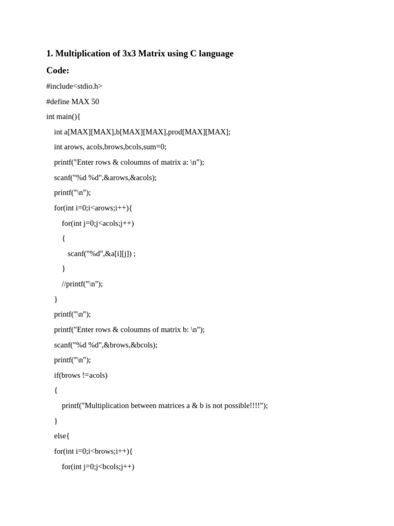 1.Define and initialize integer arrays for matrix A, B and resultant matrix Prod with maximum