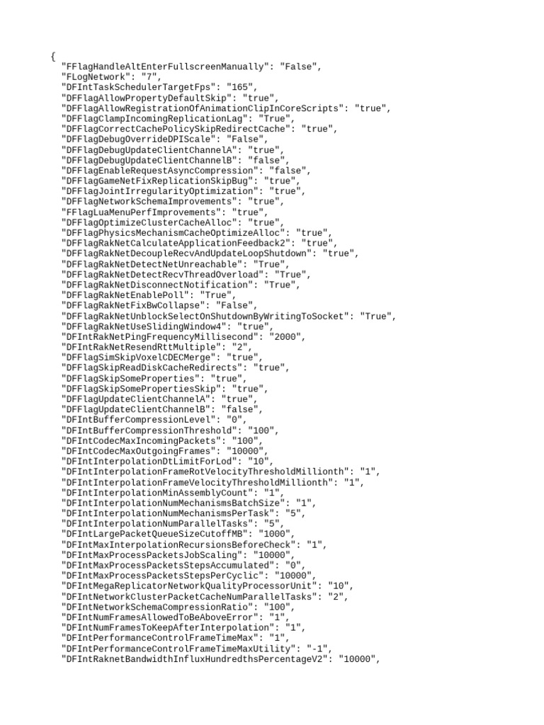 The document contains a series of configuration flags and parameters related to network performance, animation, and rendering settings for a software application. Key features include optimizations for network replication, physics calculations, and input handling. Various flags indicate whether certain features are enabled or disabled, along with specific integer values that dictate performance thresholds and limits.