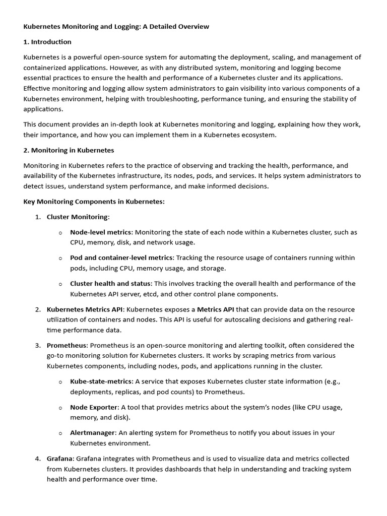 Effective monitoring and logging in Kubernetes are critical for ensuring the reliability, performance, and