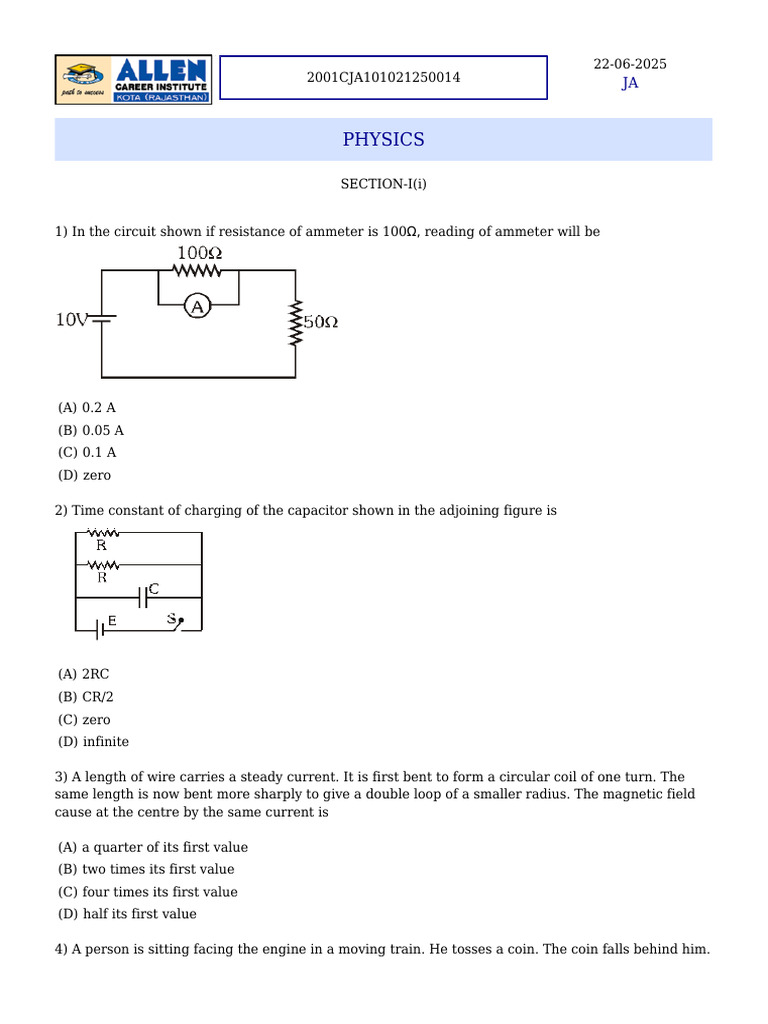 1) In the circuit shown if resistance of ammeter is 100Ω, reading of ammeter will be