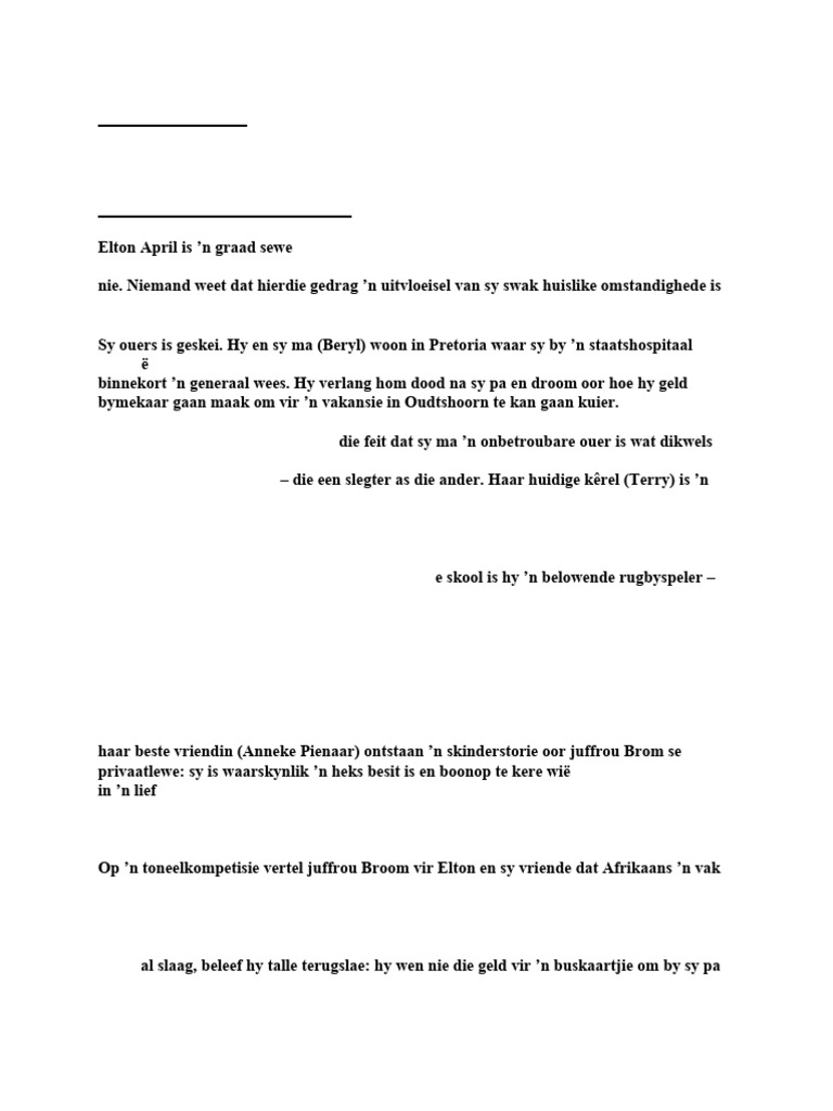 often leave Elton feeling neglected and poor. He misses his father in Oudtshoorn. His biggest dream is