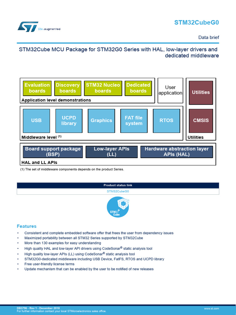It also comprises the STM32CubeG0 MCU Package composed of the STM32Cube™ hardware abstraction layer