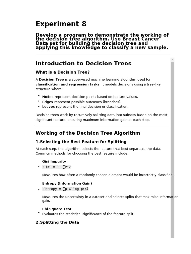 the decision tree algorithm. Use Breast Cancer