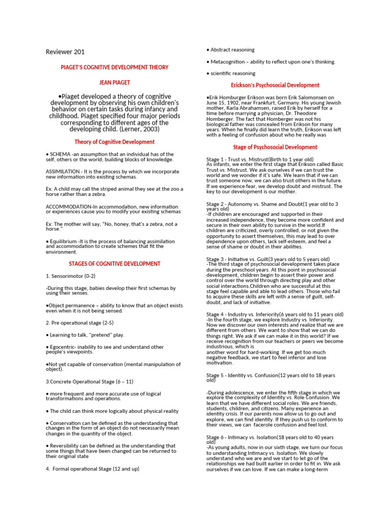 •Piaget developed a theory of cognitive •Erik Homburger Erikson was born Erik Salomonsen on