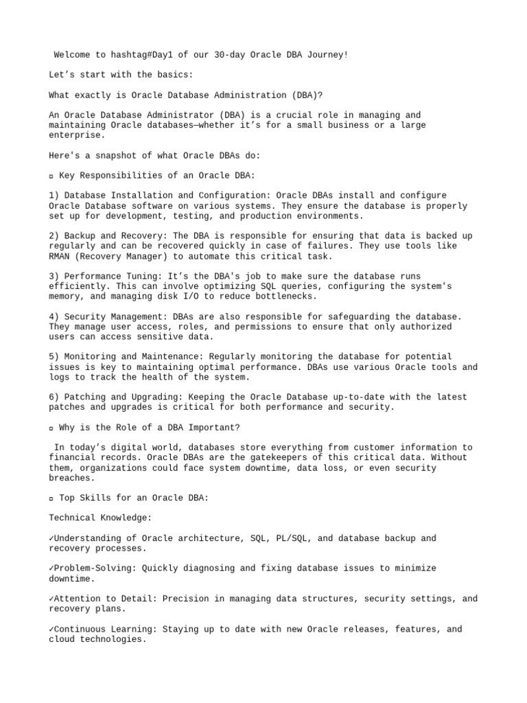 Welcome to hashtag#Day1 of our 30-day Oracle DBA Journey!
