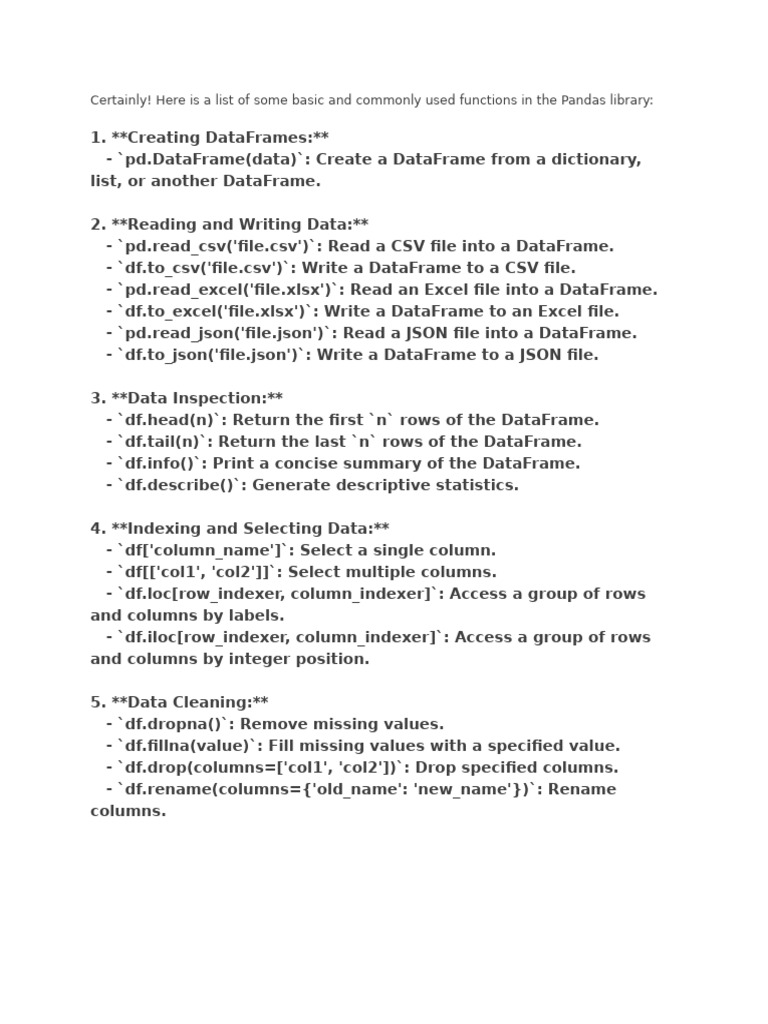 Here is a list of some basic and commonly used functions in the Pandas library:
