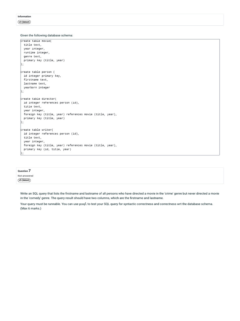 Your query must be runnable. You can use psql to test your SQL query for syntactic correctness and correctness wrt the database schema.