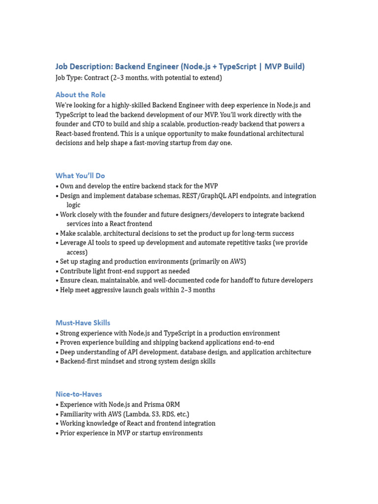 TypeScript to lead the backend development of our MVP. You’ll work directly with the