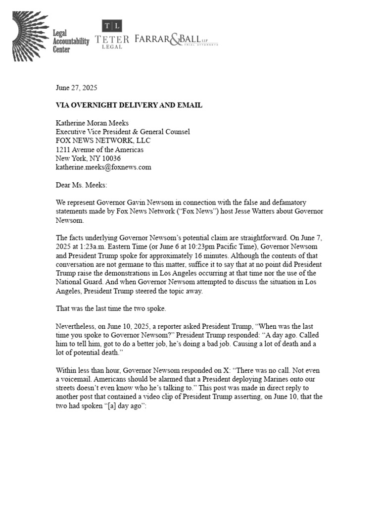 We represent Governor Gavin Newsom in connection with the false and defamatory