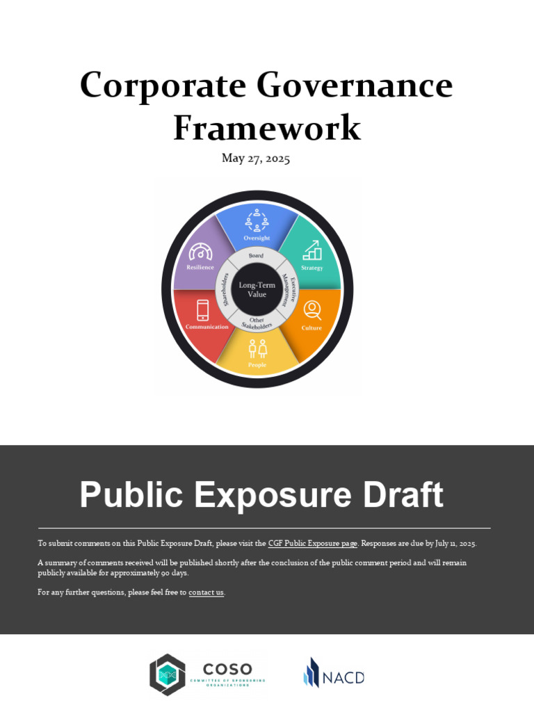 • Boards. The CGF’s flexible yet comprehensive approach empowers boards to confirm that their approach to corporate