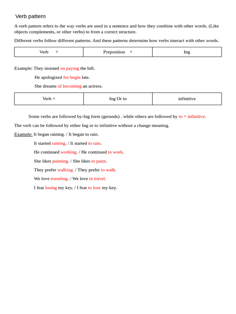 A verb pattern refers to the way verbs are used in a sentence and how they combine with other words. (Like