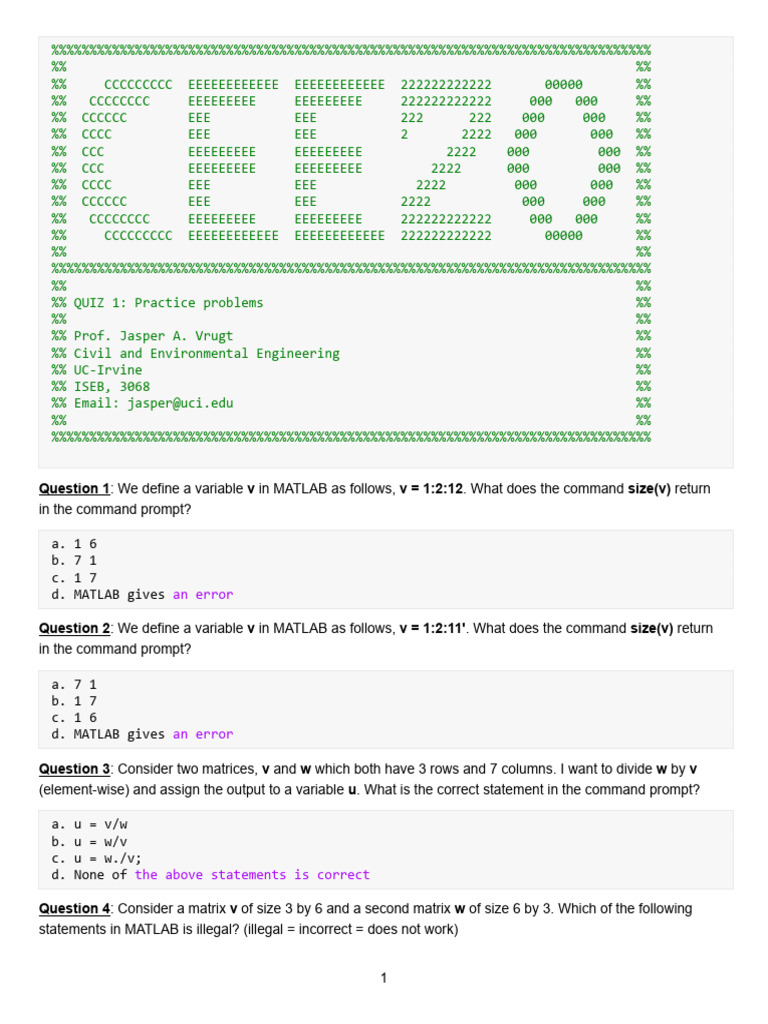 Question 1: We define a variable v in MATLAB as follows, v = 1:2:12. What does the command size(v) return