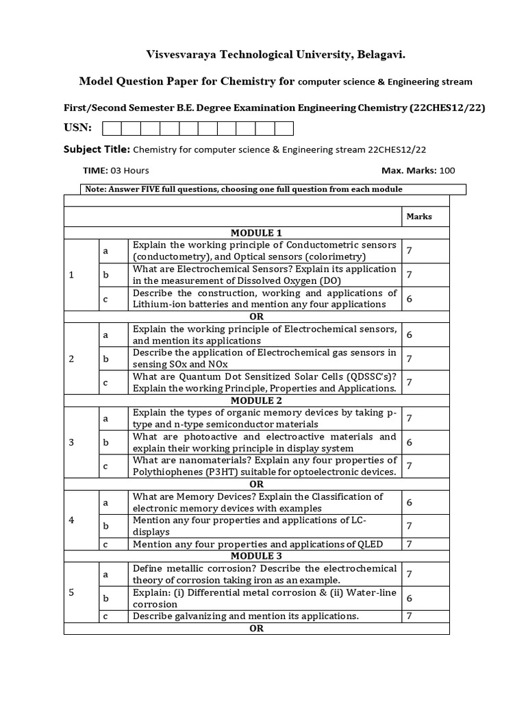 Model Question Paper for Chemistry for computer science & Engineering stream