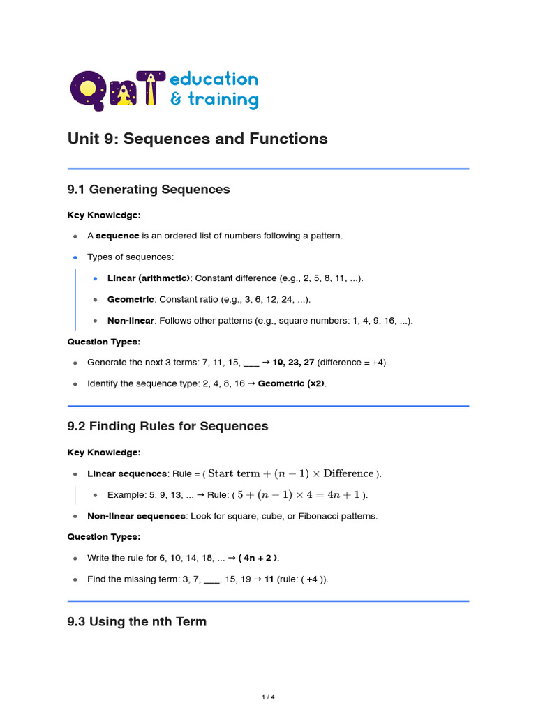 9.3 Using nth Term Calculate any term directly. "50th term of ( 2n - 5 )?" → 95.