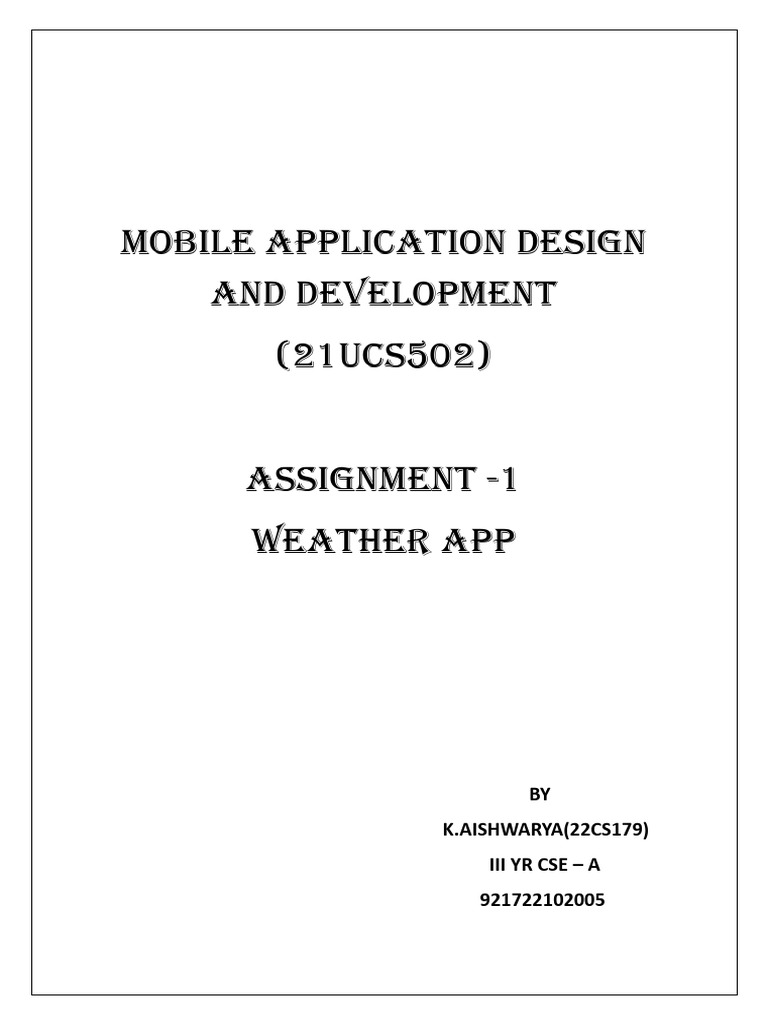 This document is an assignment for a mobile application design and development course focused on creating a weather app. It is authored by K. Aishwarya, a third-year Computer Science student. The assignment is part of the curriculum for the course code 21UCS502.