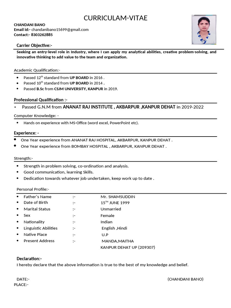 • Passed G.N.M from ANANAT RAJ INSTITUTE , AKBARPUR ,KANPUR DEHAT in 2019-2022