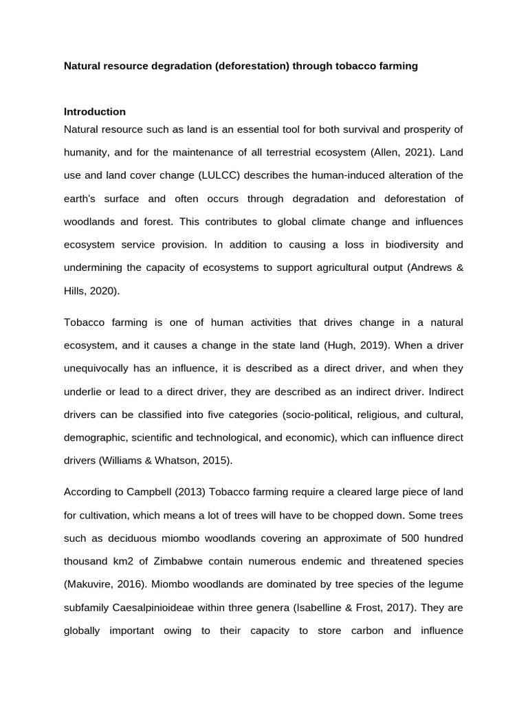 According to Campbell (2013) Tobacco farming require a cleared large piece of land