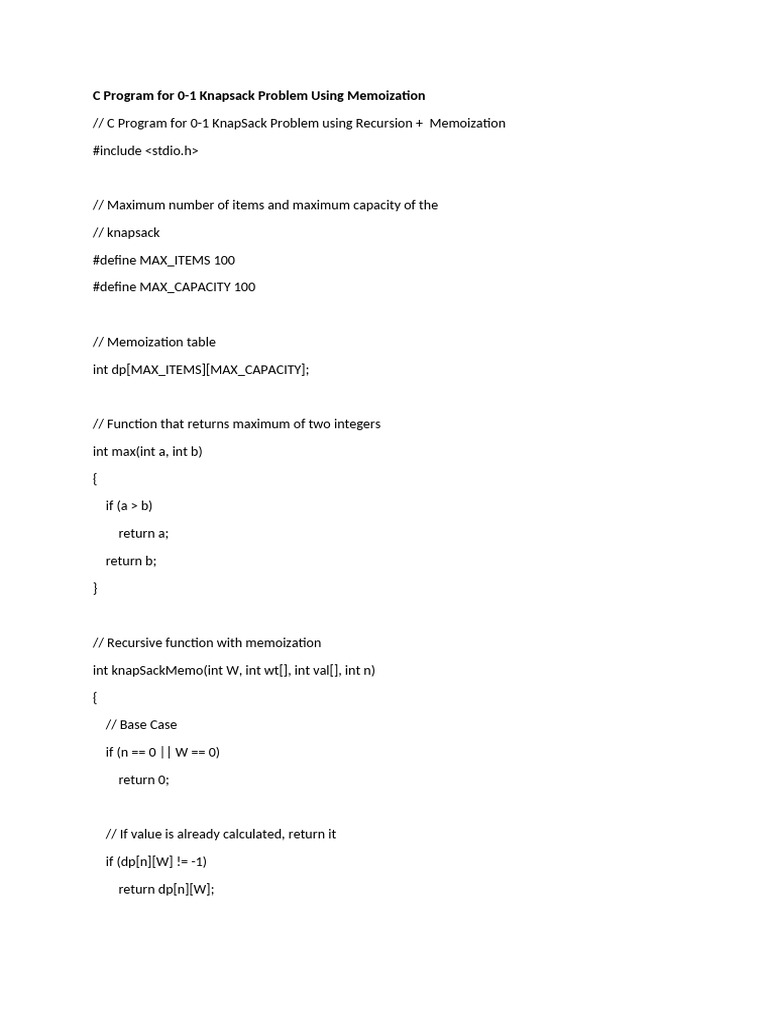 C Program for 0-1 Knapsack Problem Using Memoization
