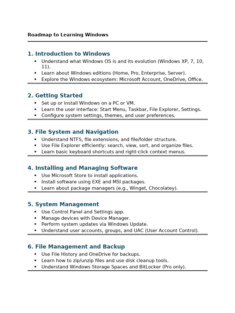 Learn the user interface: Start Menu, Taskbar, File Explorer, Settings.