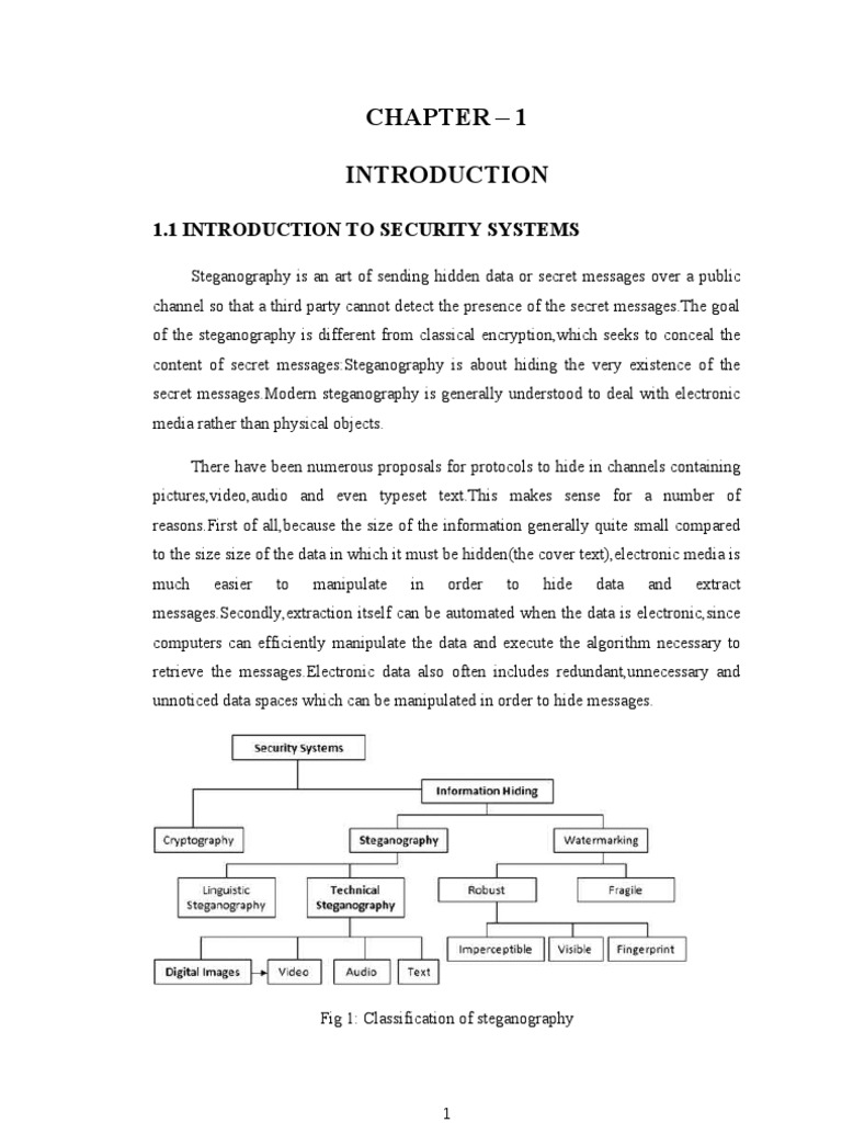 Fig4:Printed steganography The ciphertext produced by most digital steganography methods, however, is not printable. Traditional digital methods rely on perturbing noise in the channel file to hide the message, as such, the channel file must be transmitted to the recipient with no additional noise from the transmission. Printing introduces much noise in the ciphertext, generally rendering the message unrecoverable. There are techniques that address this limitation, one notable example is ASCII Art Steganography. 1.7.4 Digital steganography Modern steganography entered the world in 1985 with the advent of the personal computer being applied to classical steganography problems .Development following that was slow , but has since taken off ,going by the number of stego programs available : Over 800 digital steganography applications have been identified by the Steganography Analysis and Research Center. Digital steganography techniques are classified into four types Steganography In Text/Documents Steganography In Images Steganography In Audio Steganography in videoa
