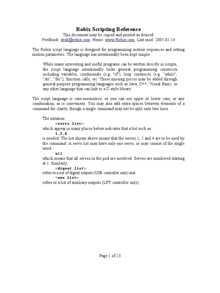 This document may be copied and printed as desired. Feedback: desk@robix.com Home: www.Robix.com Last mod: 2005-02-14 The Robix script language is designed for programming motion sequences and setting motion parameters. The language has intentionally been kept simple. While many interesting and useful programs can be written directly in scripts, the script language intentionally lacks general programming constructs including variables, conditionals (e.g. "if"), loop constructs (e.g. while, do, for), function calls, etc. These missing pieces may be added through general-purpose programming languages such as Java, C++, Visual Basic, or any other language that can link to a C-style library. The script language is case-insensitive, so you can use upper or lower case, or any combination, as is convenient. You may also add extra spaces between elements of a command for clarity, though a single command may not be split onto two lines. The notation: