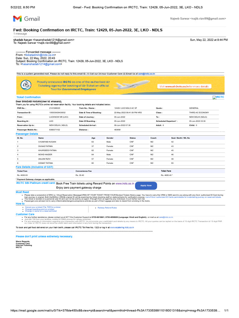 5/22/22, 8:50 PM Gmail - Fwd: Booking Confirmation on IRCTC, Train: 12429, 05-Jun-2022, 3E, LKO - NDLS