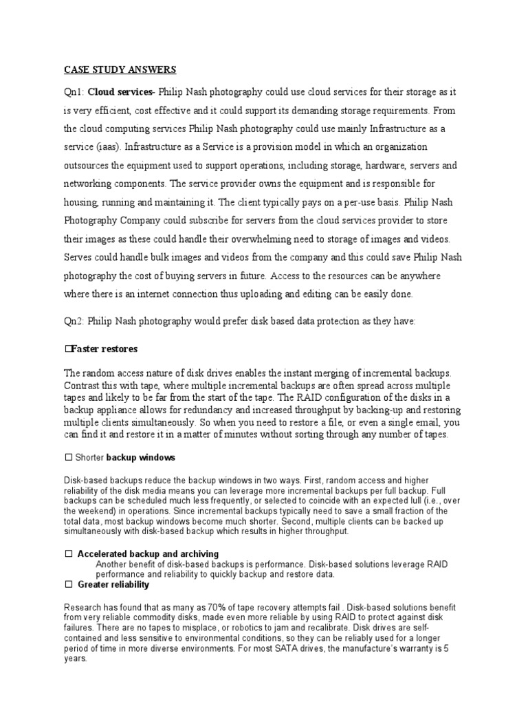 Qn1: Cloud services- Philip Nash photography could use cloud services for their storage as it is very efficient, cost effective and it could support its demanding storage requirements. From the cloud computing services Philip Nash photography could use mainly Infrastructure as a service (iaas). Infrastructure as a Service is a provision model in which an organization outsources the equipment used to support operations, including storage, hardware, servers and networking components. The service provider owns the equipment and is responsible for housing, running and maintaining it. The client typically pays on a per-use basis. Philip Nash Photography Company could subscribe for servers from the cloud services provider to store their images as these could handle their overwhelming need to storage of images and videos. Serves could handle bulk images and videos from the company and this could save Philip Nash photography the cost of buying servers in future. Access to the resources can be anywhere where there is an internet connection thus uploading and editing can be easily done. Qn2: Philip Nash photography would prefer disk based data protection as they have: