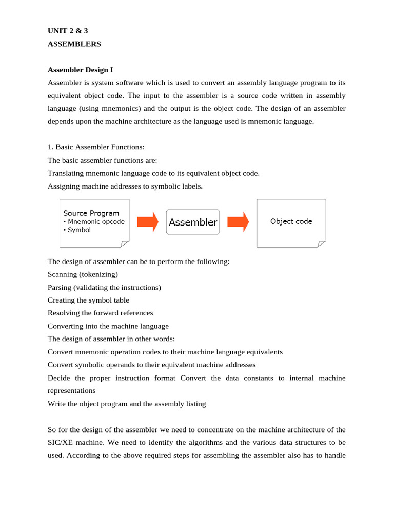 language (using mnemonics) and the output is the object code. The design of an assembler