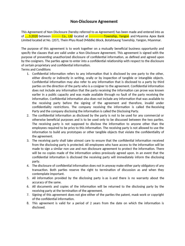 of …..3.2020 between --------- Co., Ltd located at ---------------Township, Yangon and Myanma Apex Bank