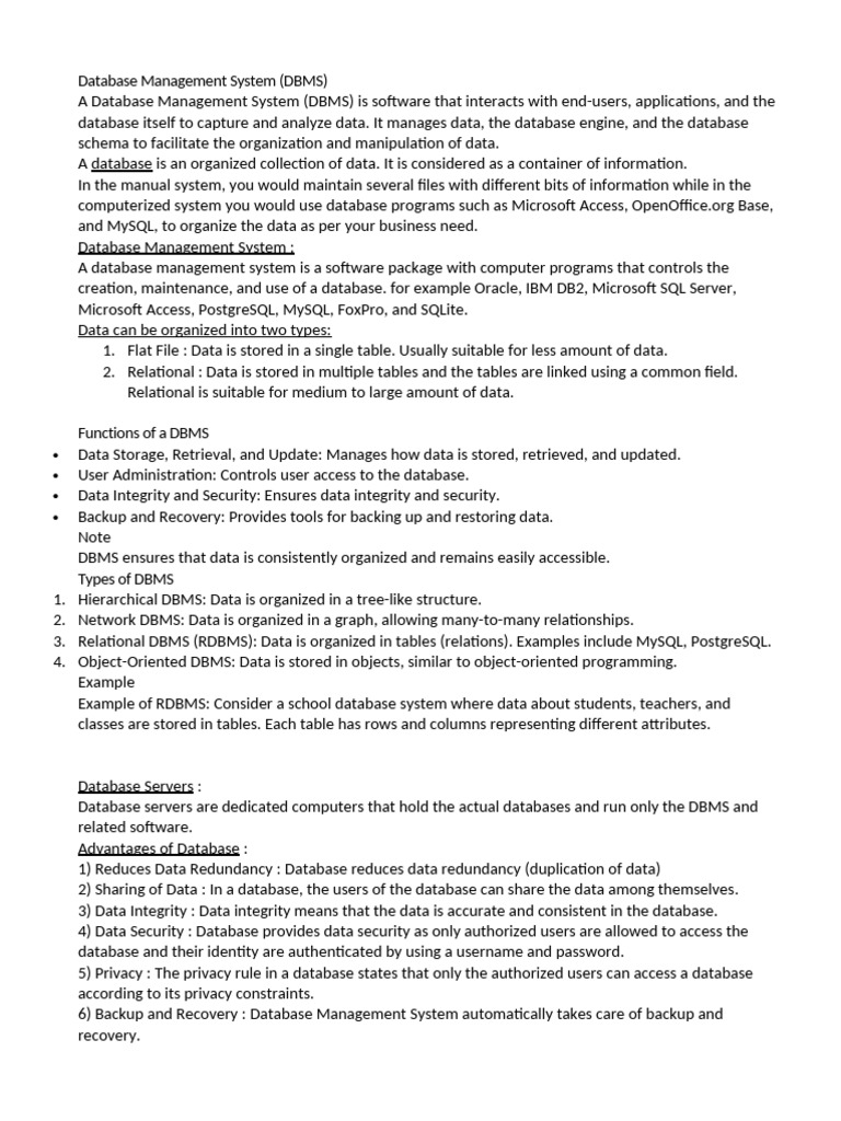 3. Relational DBMS (RDBMS): Data is organized in tables (relations). Examples include MySQL, PostgreSQL.